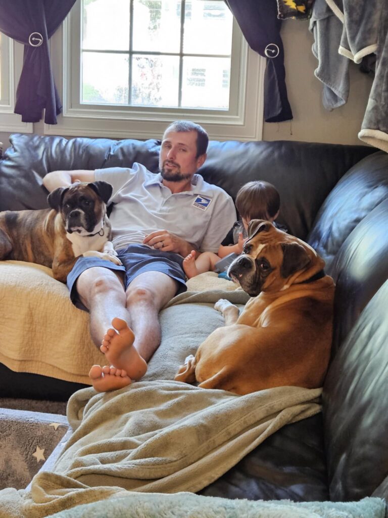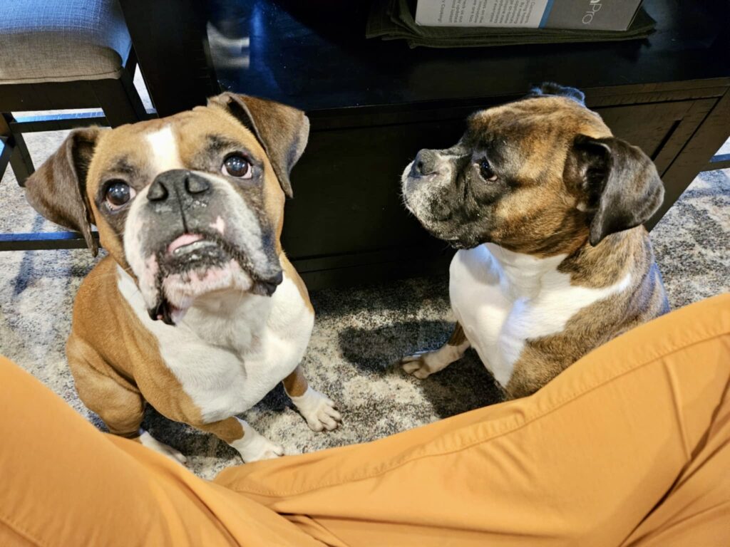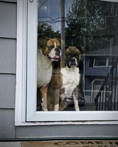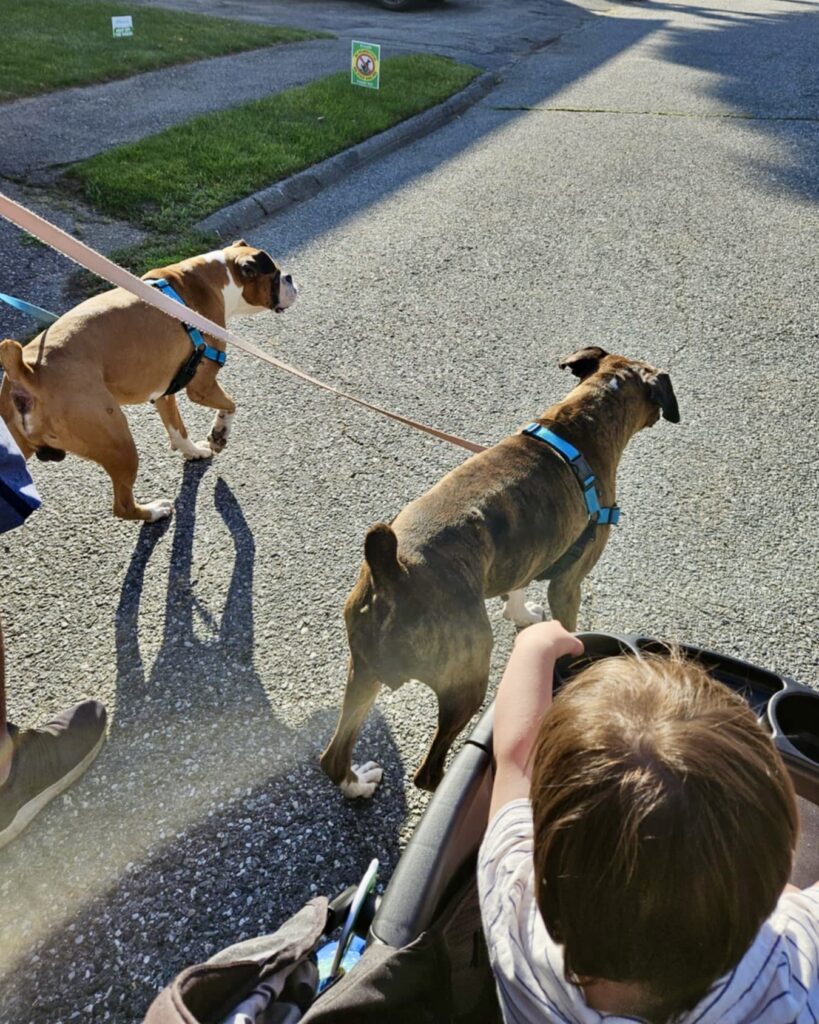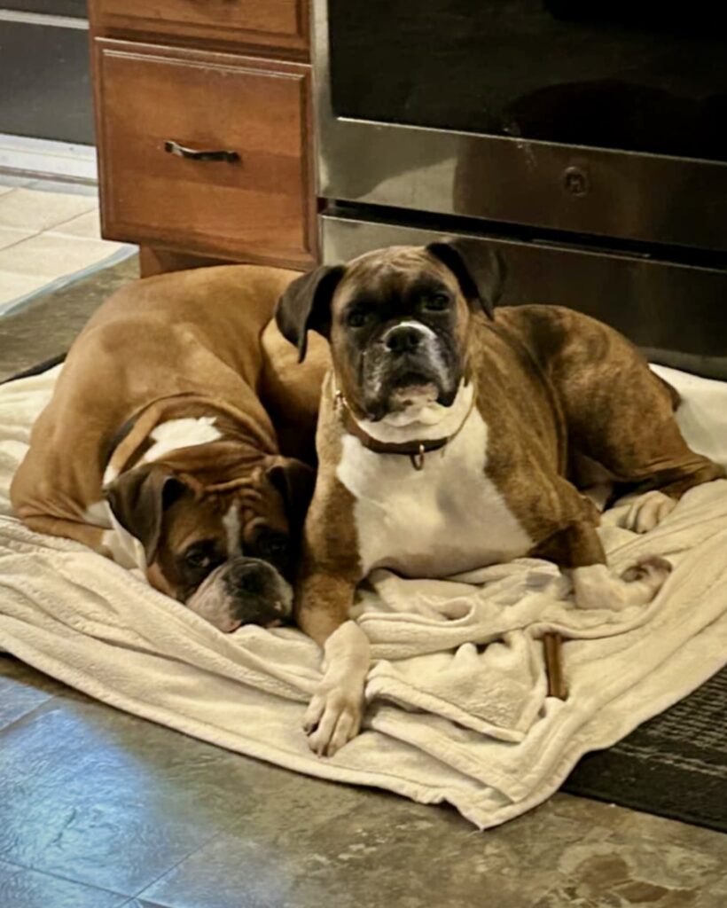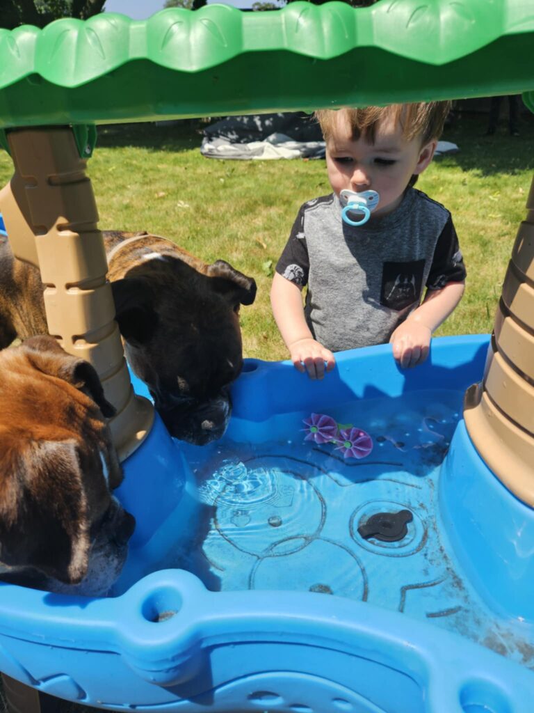 They are bonded boxer pair retired by a breeder just in time to enjoy the dog days of summer…as dogs. They are wonderful with children, full of funny antics and protective of their family.