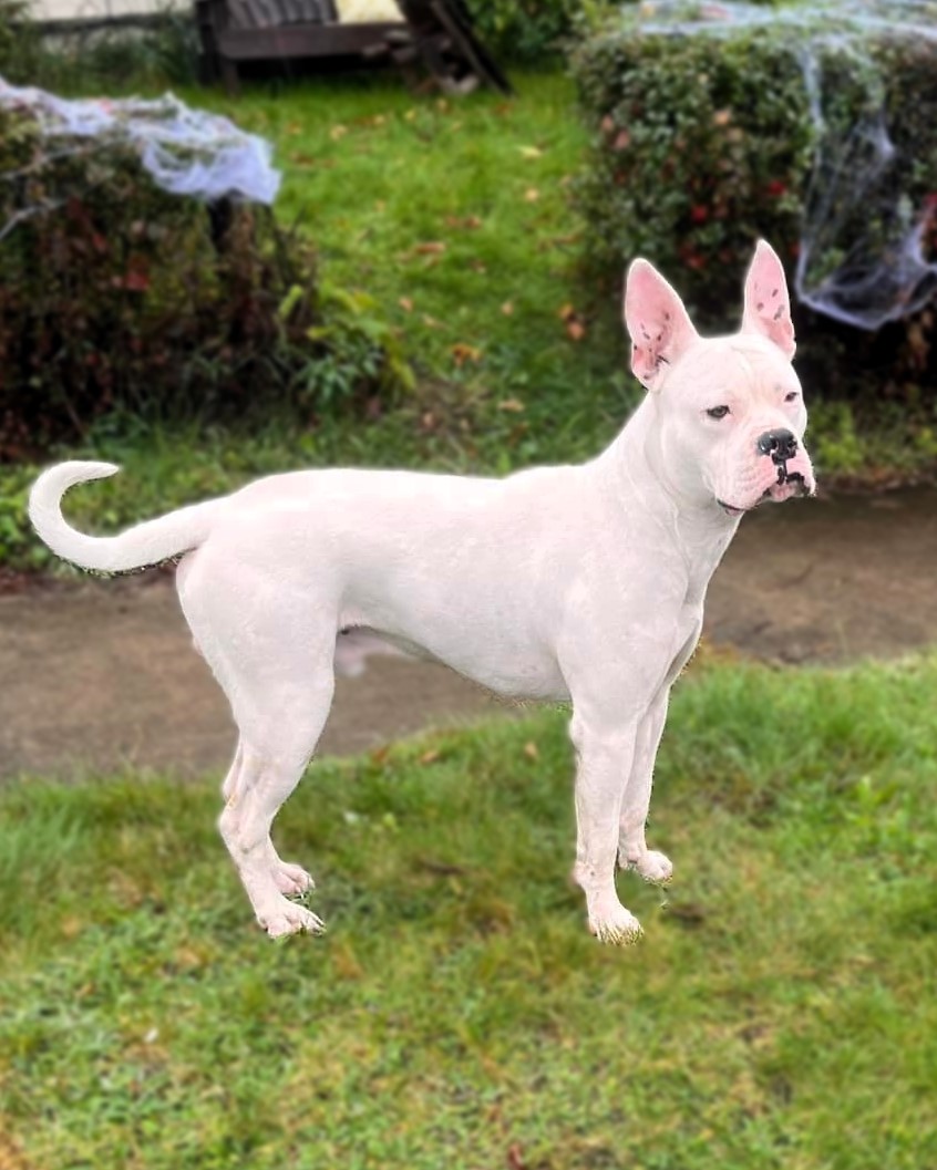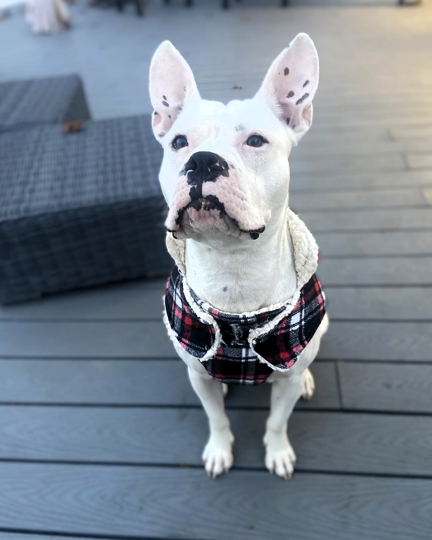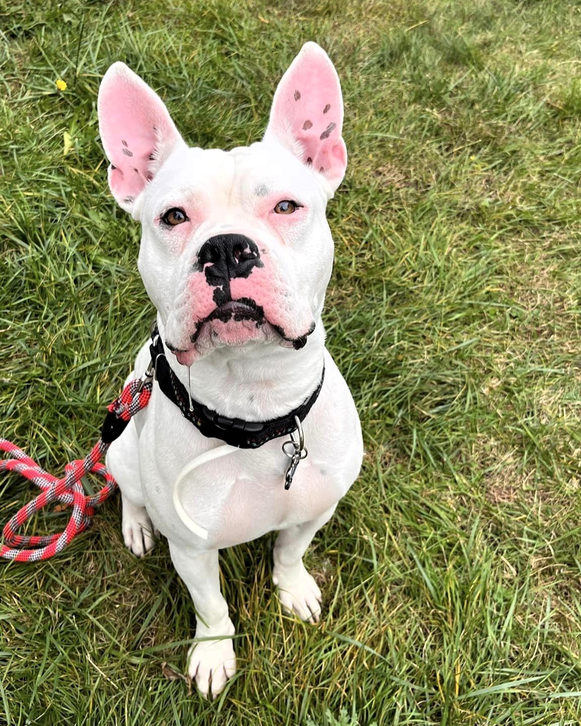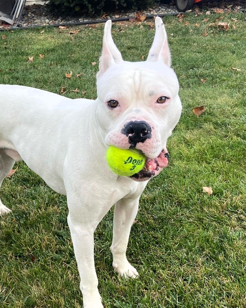 Say hi to Titus, more affectionately known as Ears. This exceptionally charming young fella was roaming the streets, loaded with fleas and very hungry. He was found by a kind and dog loving human who was able to locate and reunite him with his owner. Less than 24 hours later, Titus was found roaming the streets yet again. After contacting his owners for the 2nd time, they admitted to no longer wanting him. Titus is now safe, up to date on veterinary care and enjoying the comforts of a warm bed and lots of TLC! His finder reports he is a respectful house guest and sleeps nicely in his crate. He is currently working on sit, stay and leash manners, but is already a pro at giving the best kisses! He desires a home where he can be a cherished family member, no more roaming the streets for this guy. He is estimated to be around 18 months of age and believed to be a Boxer/American bulldog mix. Titus is very friendly with other dogs, loves to play fetch but has no history with cats or small children. Located in PA. |