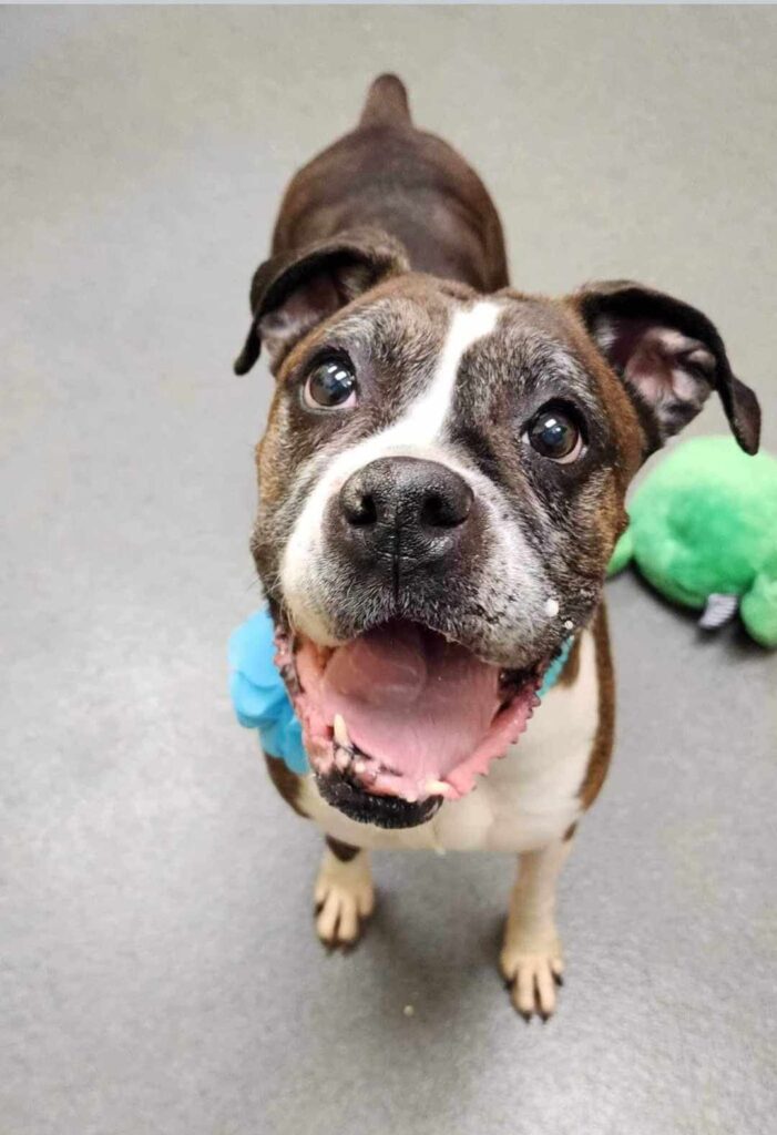 Blind boxer mom abandoned with nursing puppies rescued during a freeze. Receiving veterinary attention will be available for adoption soon