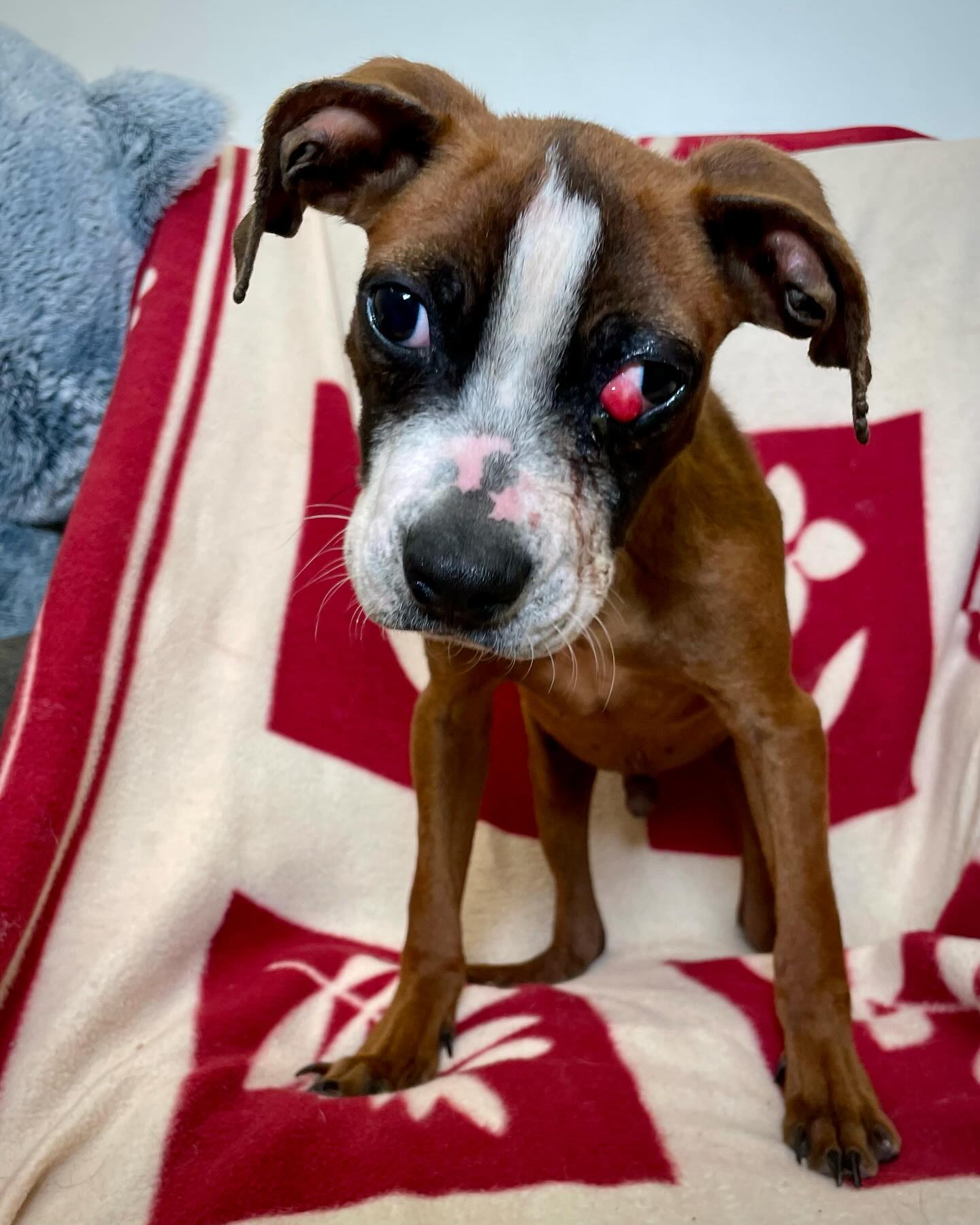 cute! This little guy was found at an abandoned drug house and taken to safety by a local animal control officer. Tyke is 5 months old, 15lbs and is a fun-loving little pup! He is neutered and his cherry eye has been repaired. He continues to gain confidence and some much needed weight, and is blossoming into a real cutie pie. His future home would be one who can appreciate puppy antics, and is willing to deal with the ever changing needs of a growing and maturing dog.