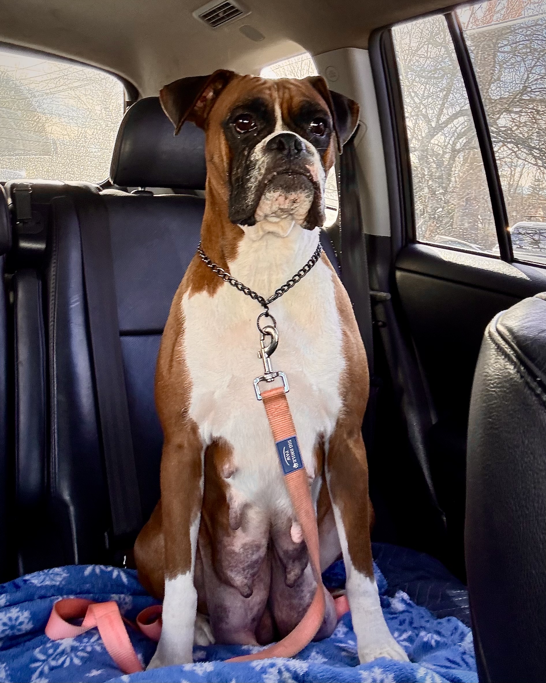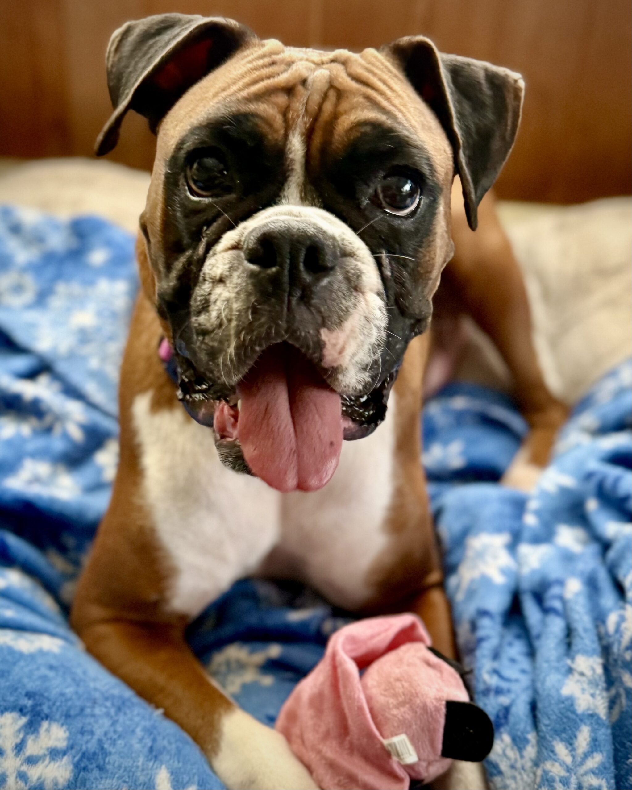 Please welcome Bailey to CH Boxer Rescue! Her owner gave her up once he realized she was pregnant with an accidental litter with a Shih Tzu. Bailey is a sweetheart – good with other dogs, cats and children. We are so happy to welcome this beauty and put an end to her breeding days. She is 2-3 years old. Bailey will be spayed, vetted and ready for adoption in mid December.