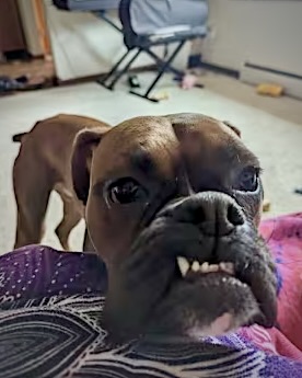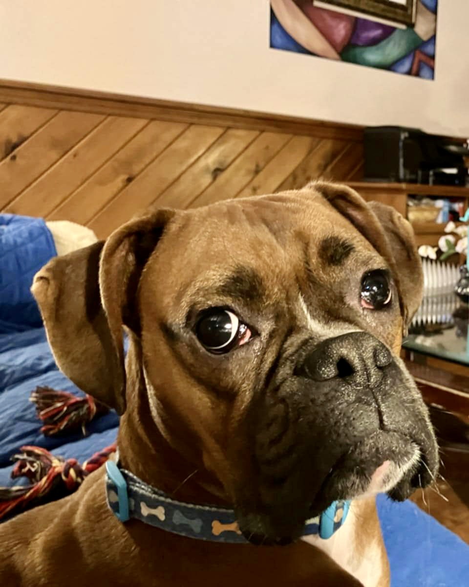 Chestnut is SUPER affectionate and craves time with his people. He’s a bit of an attention hound. He LOVES to play, take walks and be active. He is a typical young boxer boy (2YO) so in other words…goofball, clown, quirky with couch potato moments!