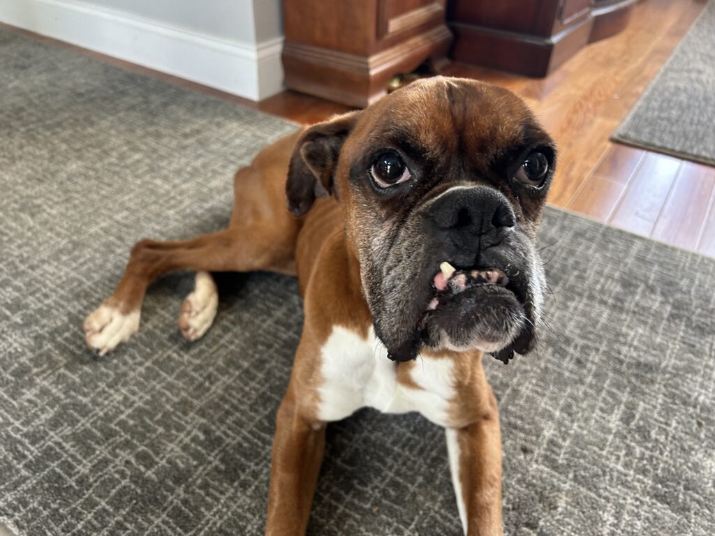 Meet Blue! We happen to think seniors are sensational! He’s 7 years of age and came to rescue after his family left him at the shelter. Blue likes to play with his tennis ball and has fun romping in the yard with his foster sister… he’s a great mix of boxer energy and boxer cuddles on the couch. He knows sit, stay and paw and walks exceptionally well on leash. He is housebroken and up to date on all veterinary care. Blue is currently fostered in Lebanon, Pa.