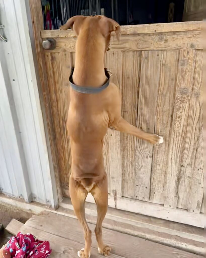 Tucker approached a car during a scary storm, panicked and starving. Tucker pleaded for help and a good samaritan reached out to us. He’s been slowly but steadily putting on pounds and gaining confidence. He’s met other dogs and enjoys sniffing around the yard with them. He’s a good boy