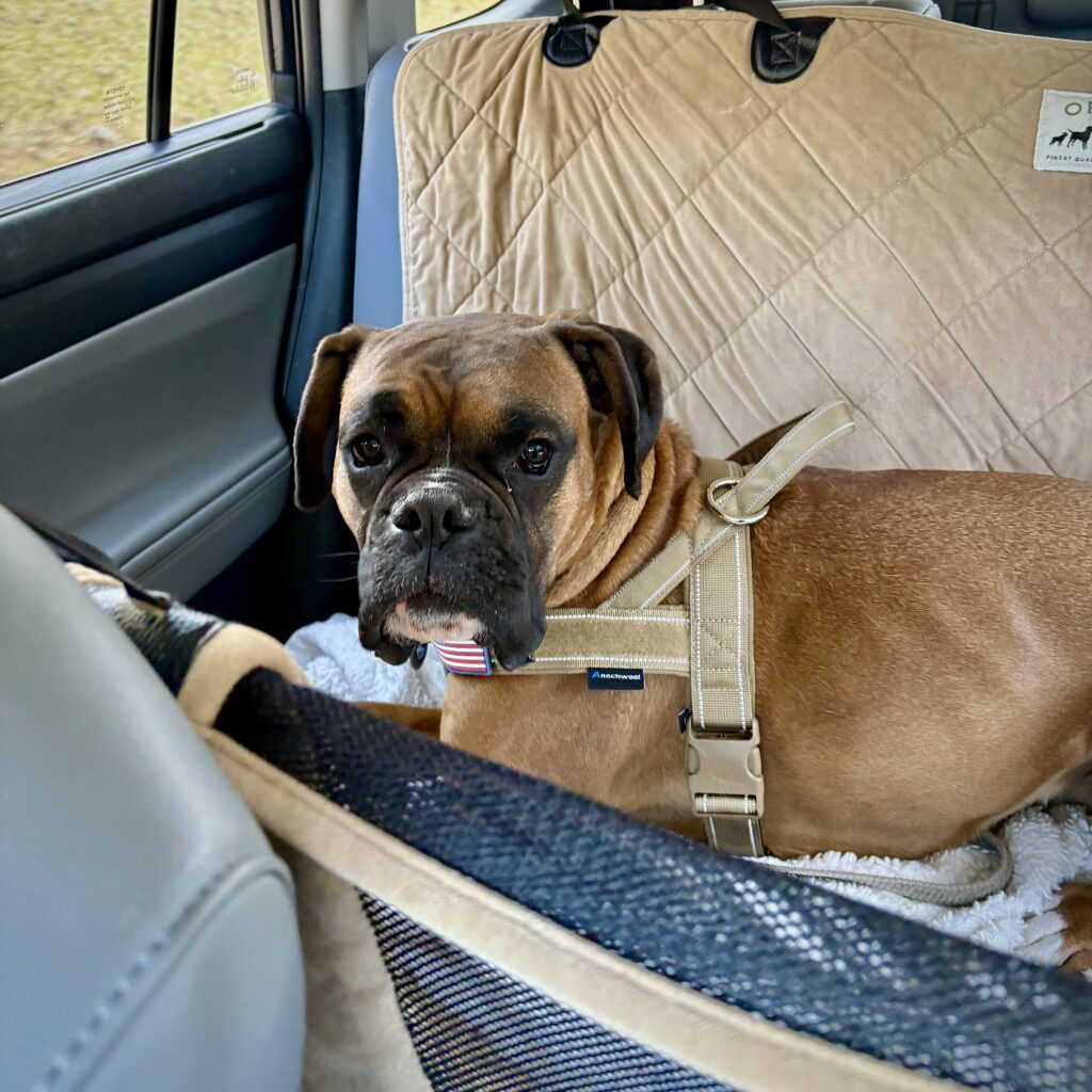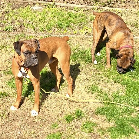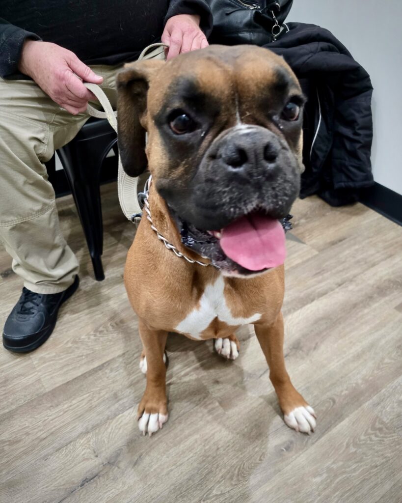This energetic, playful boxer boy is on the hunt for his forever home. He loves zoomies, snuggles on the sofa, and is good with kids! He is big and active so children should be sturdy (and supervised). He lived with a female boxer before coming to CH Boxer Rescue . Milo would thrive in a home with a fenced-in yard where he can run and play to his heart’s content.